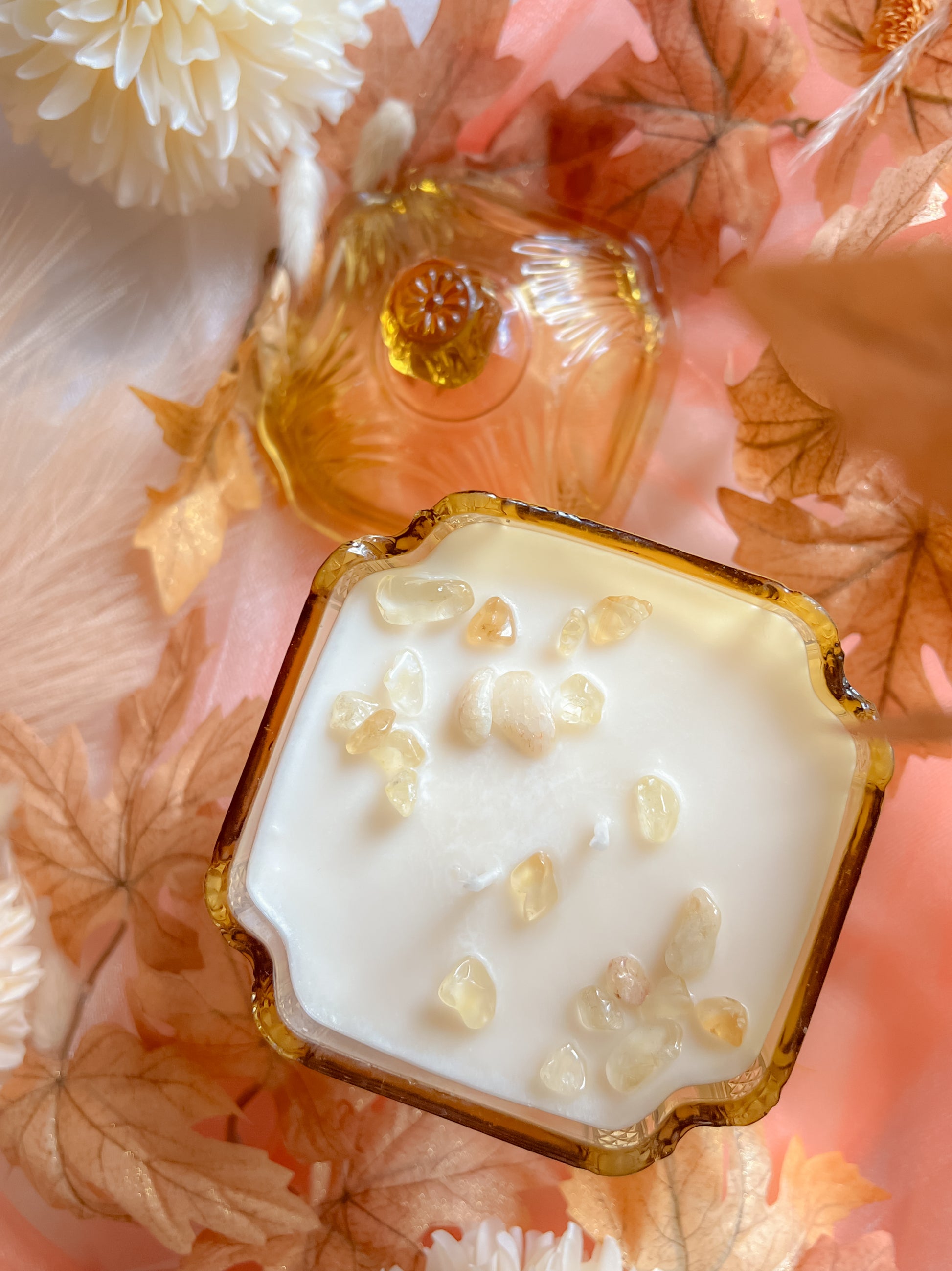 The surface is adorned with genuine citrine crystals, radiating warmth, joy, and positive energy, adding a touch of elegance and magical sparkle. Once burned, the candy dish remains a stunning vintage keepsake, perfect for display, seasonal decor, or storing little treasures.