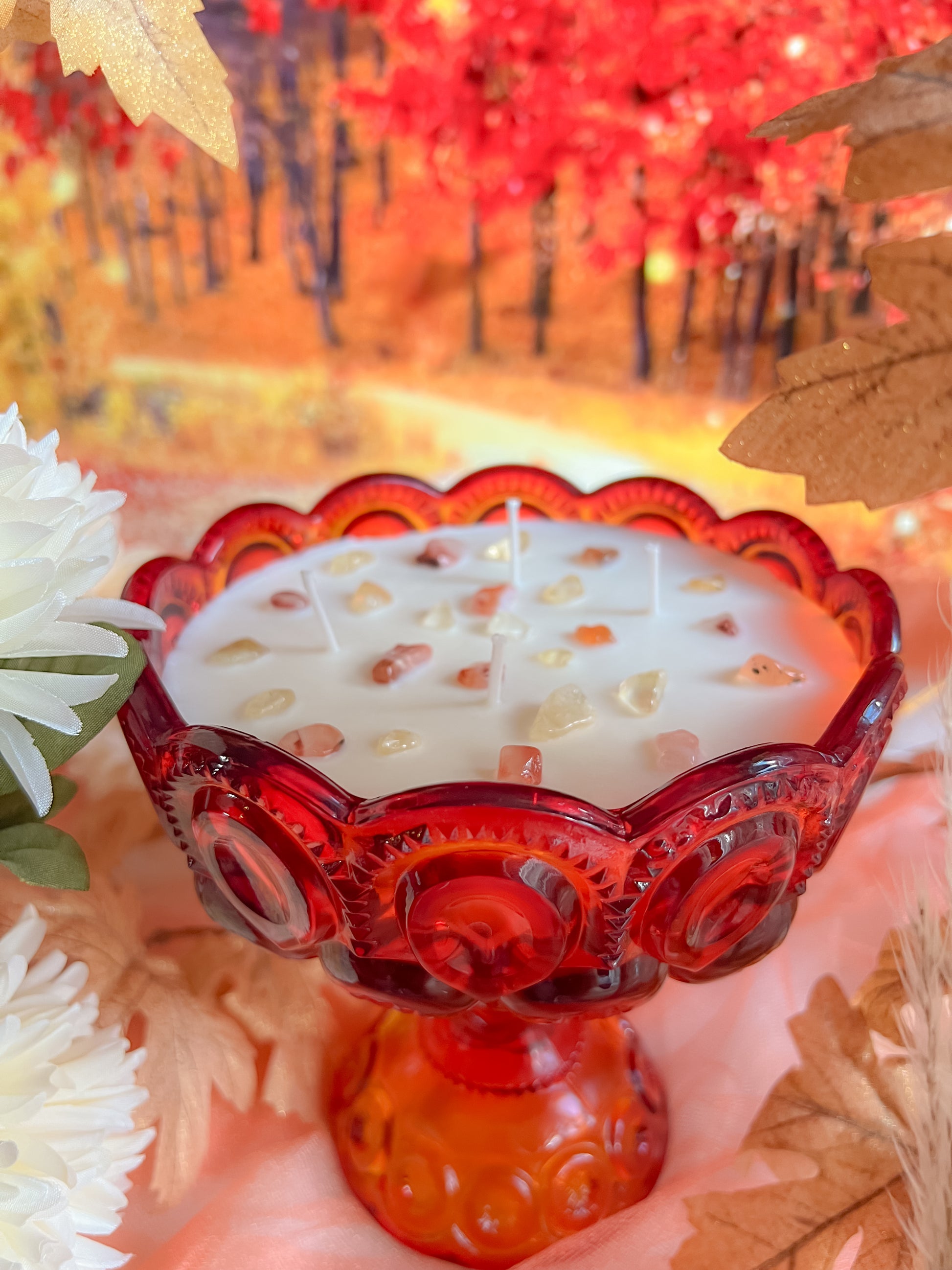 This breathtaking vintage amberina compote glows in rich ruby red and golden amber tones, its fiery gradient from yellow to red, catching the light in the most magical way. Hand poured with the spellbinding scent of Enchanted Orchard- a fragrant blend of crisp fruit, autumn spice, and a touch of earthy magic. This is a truly show stopping candle!