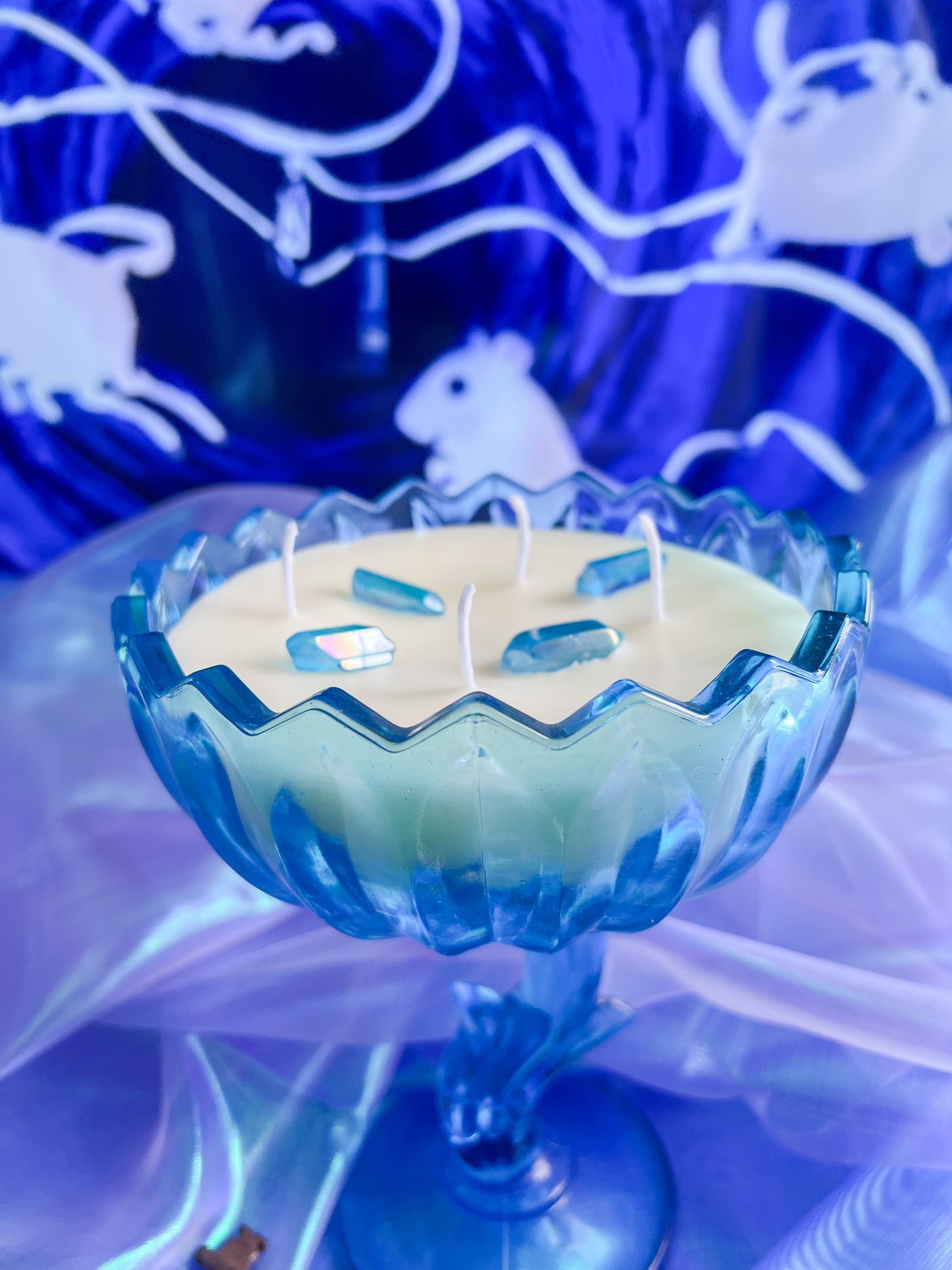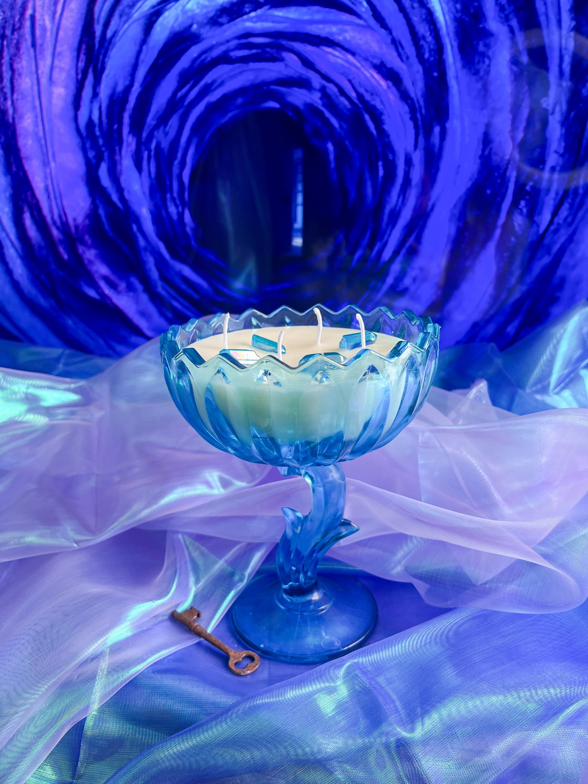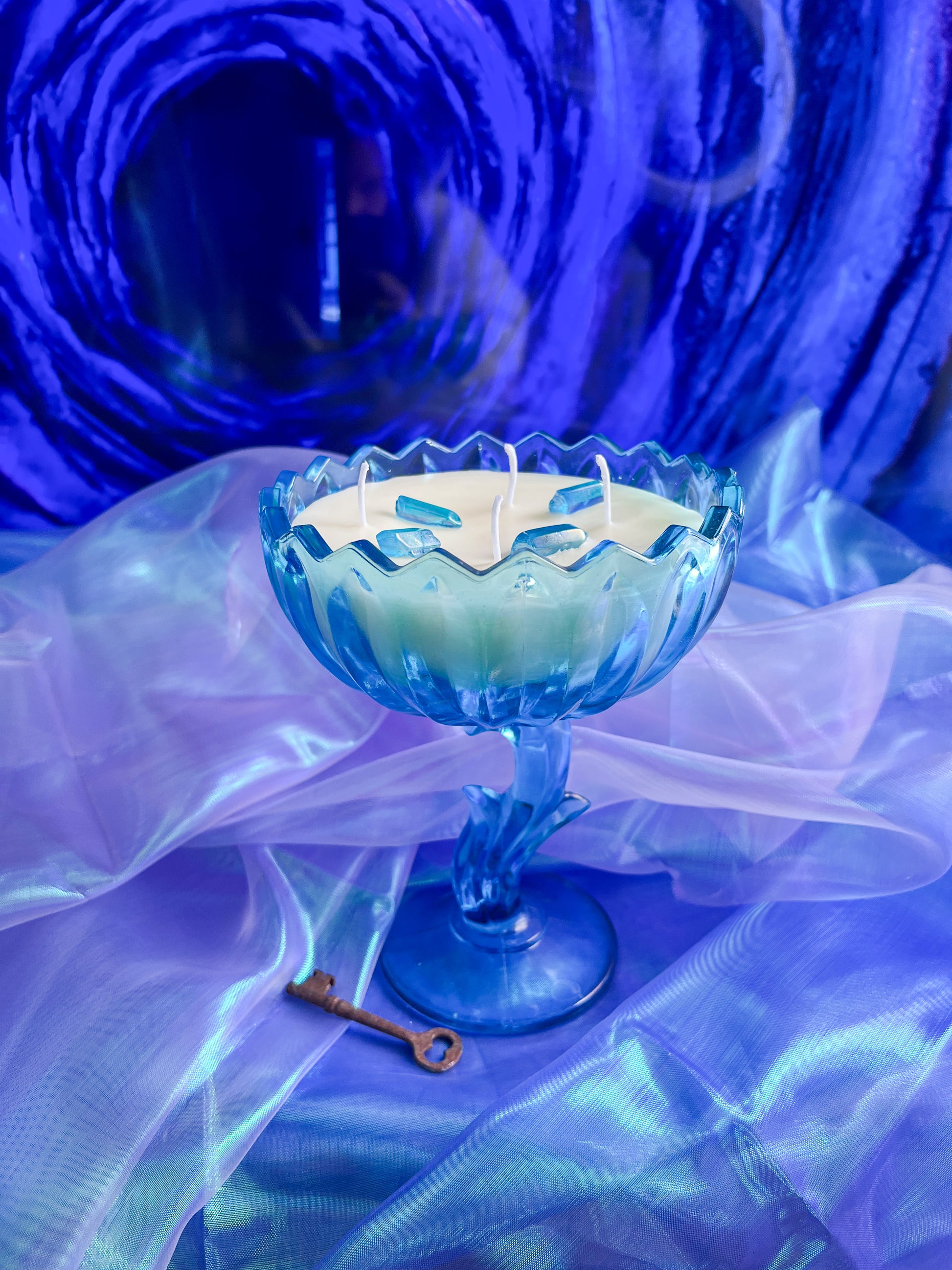 This candle is hand poured in small batches using premium soy wax and set into a hand selected, specialty curated vintage Aqua Indiana glass tulip candy dish. This collectible vessel has been carefully sourced and chosen for its luminous blue tone, timeless shape, and exceptional condition. By pouring into antique and vintage glassware, each candle is given a second life as a functional piece of art, making every one truly one of a kind.