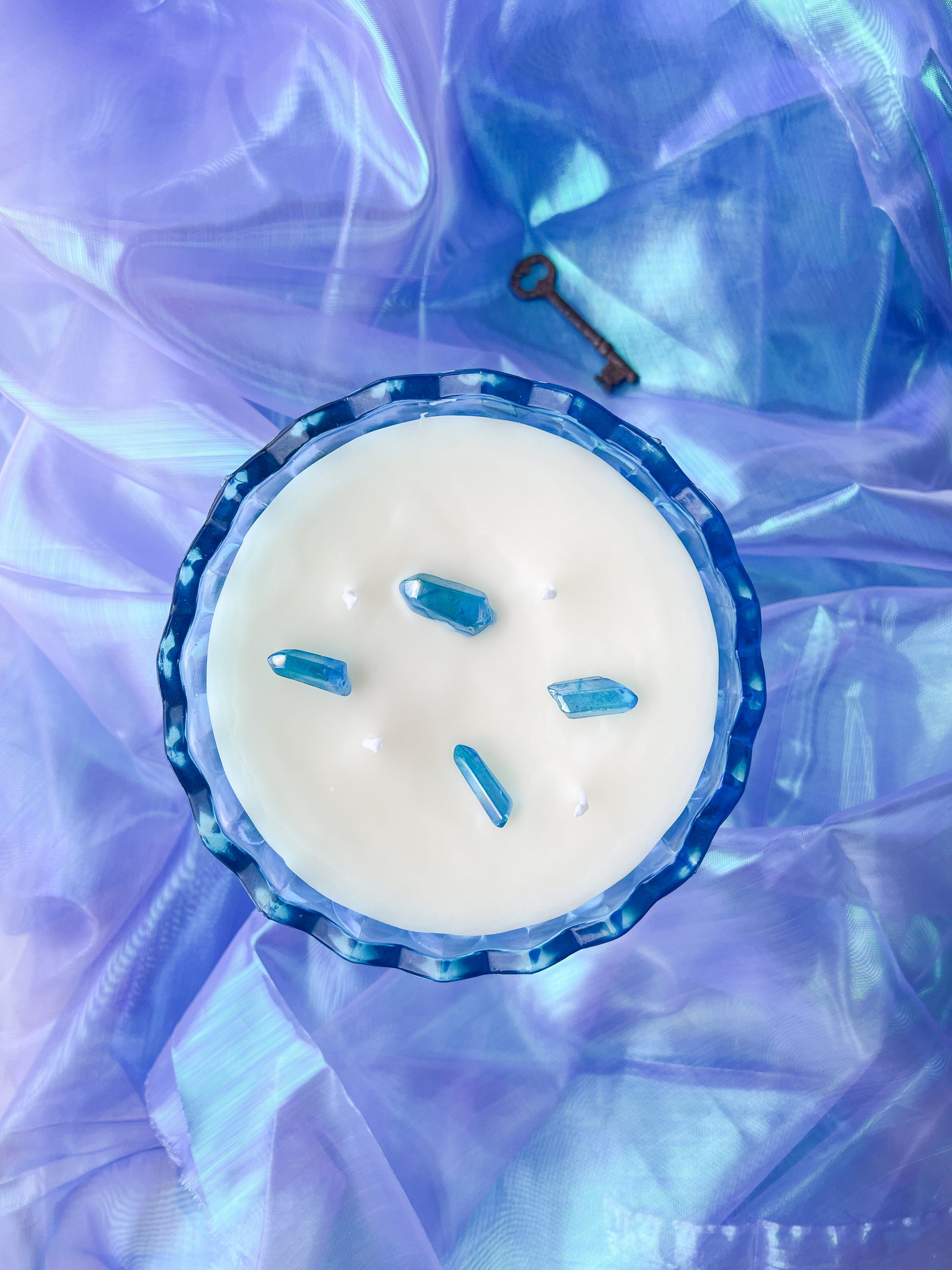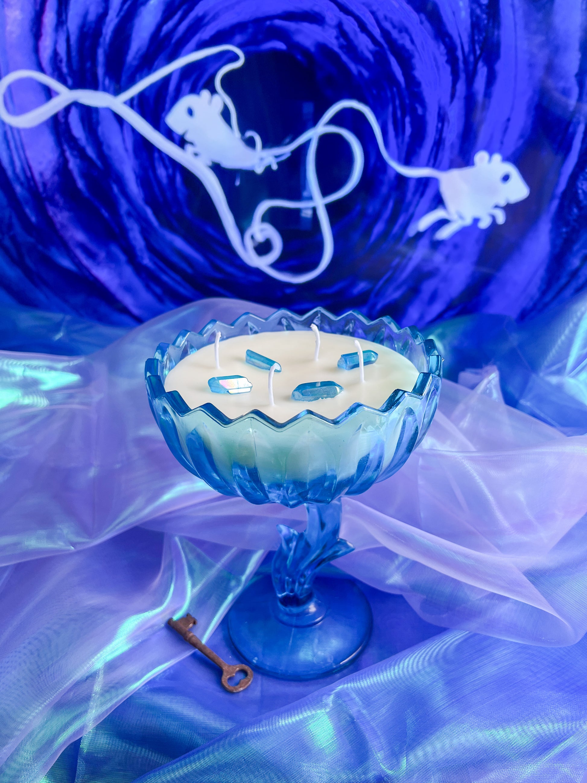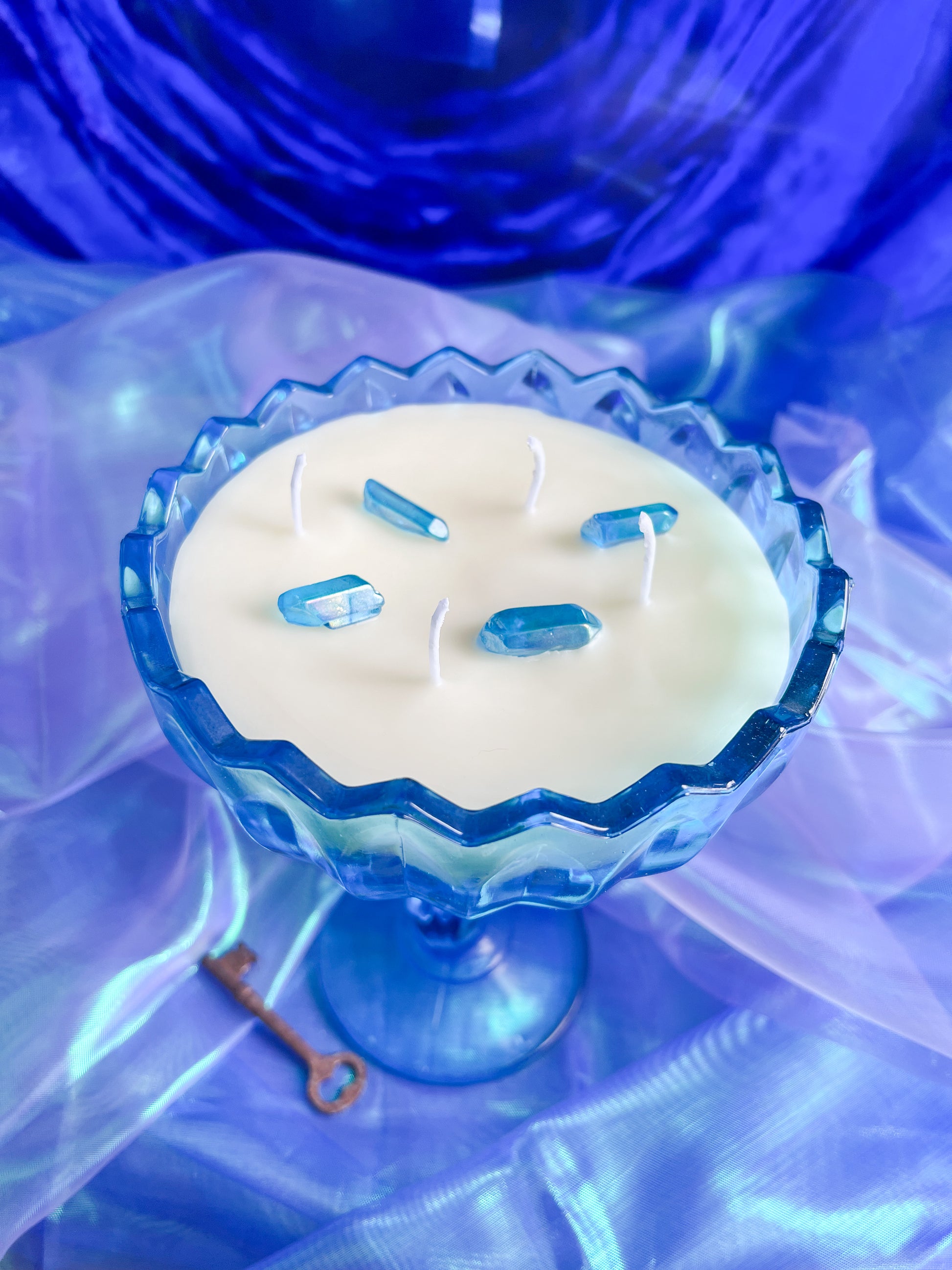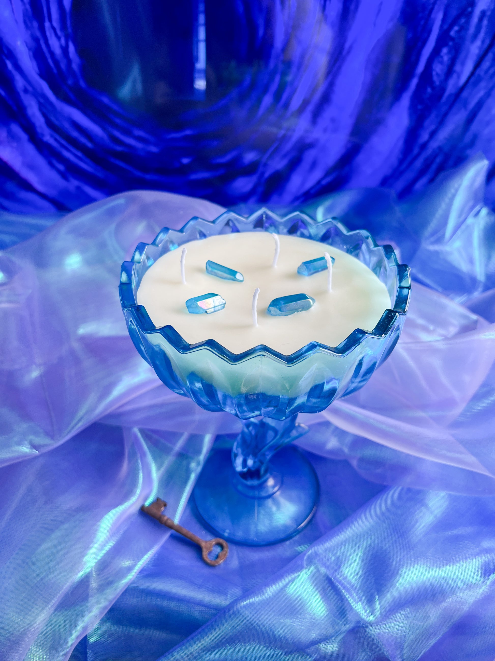 This candle is hand poured in small batches using premium soy wax and set into a hand selected, specialty curated vintage Aqua Indiana glass tulip candy dish. This collectible vessel has been carefully sourced and chosen for its luminous blue tone, timeless shape, and exceptional condition. By pouring into antique and vintage glassware, each candle is given a second life as a functional piece of art, making every one truly one of a kind.