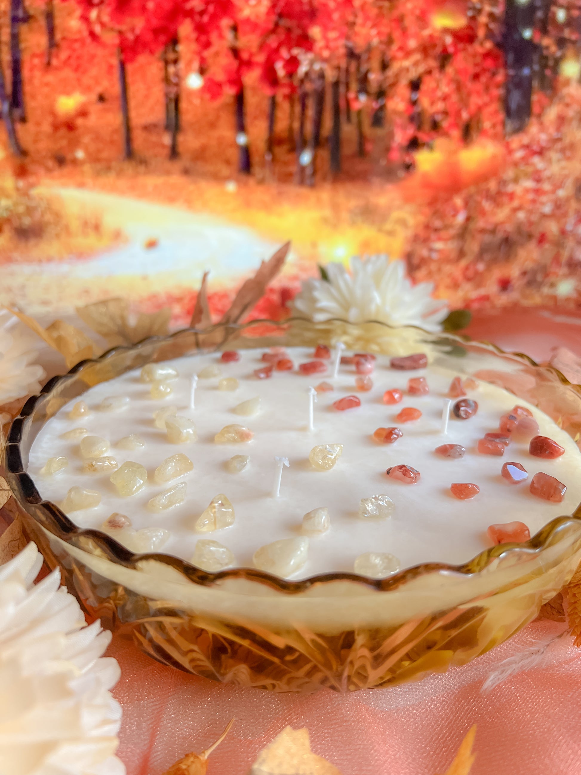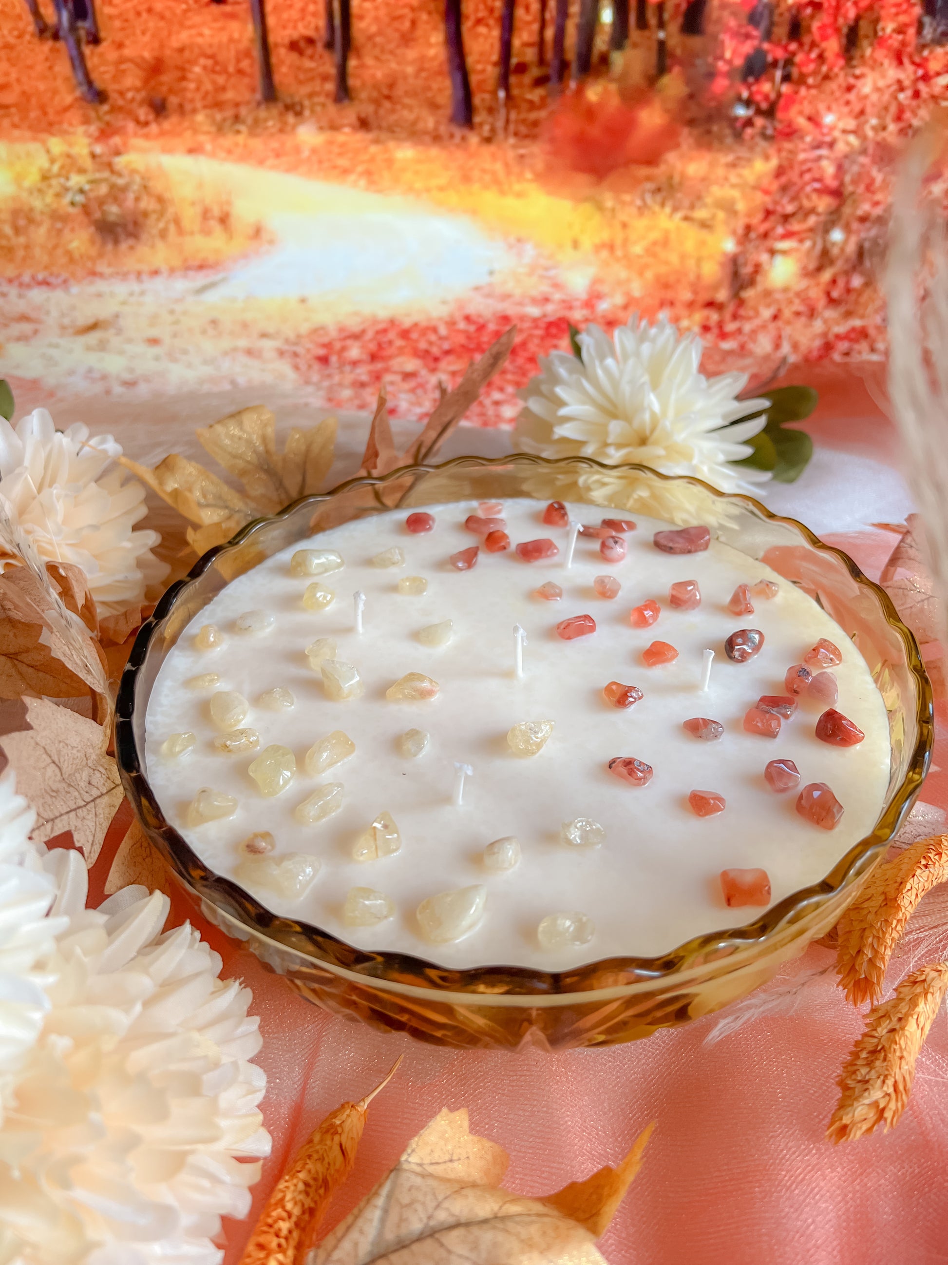 To elevate the magic, the candle is crowned with genuine citrine and carnelian crystals, radiating warmth, joy, and grounding energy. Once the candle has been enjoyed, the bowl remains a collectible piece of vintage glass, perfect for display, repurposing, or as a cherished heirloom. Vessel in mint condition no chips or cracks.