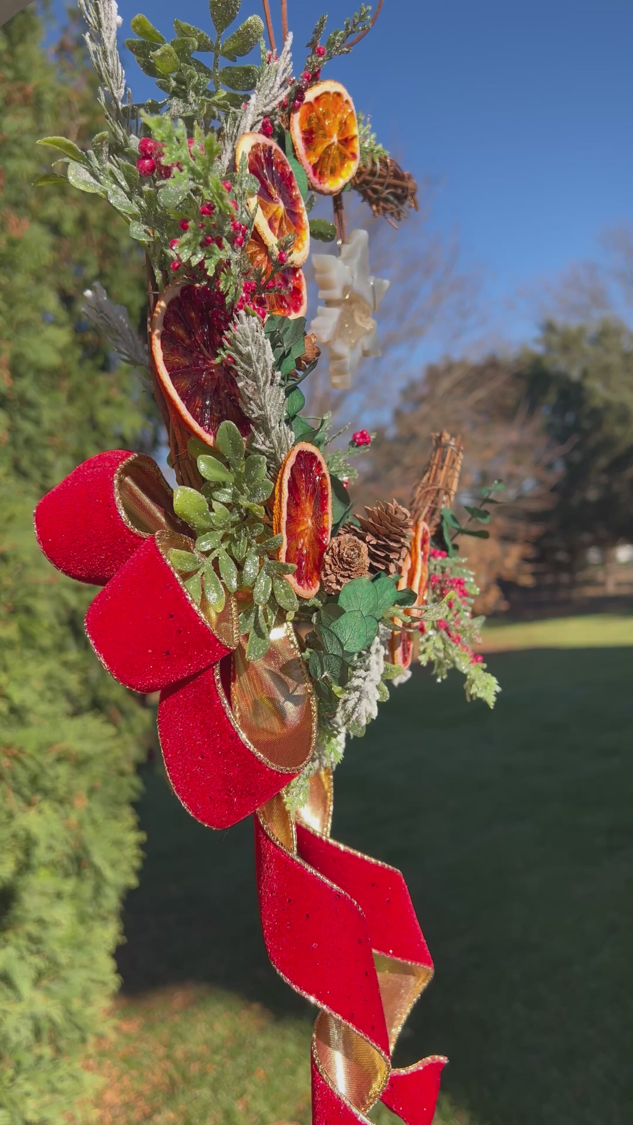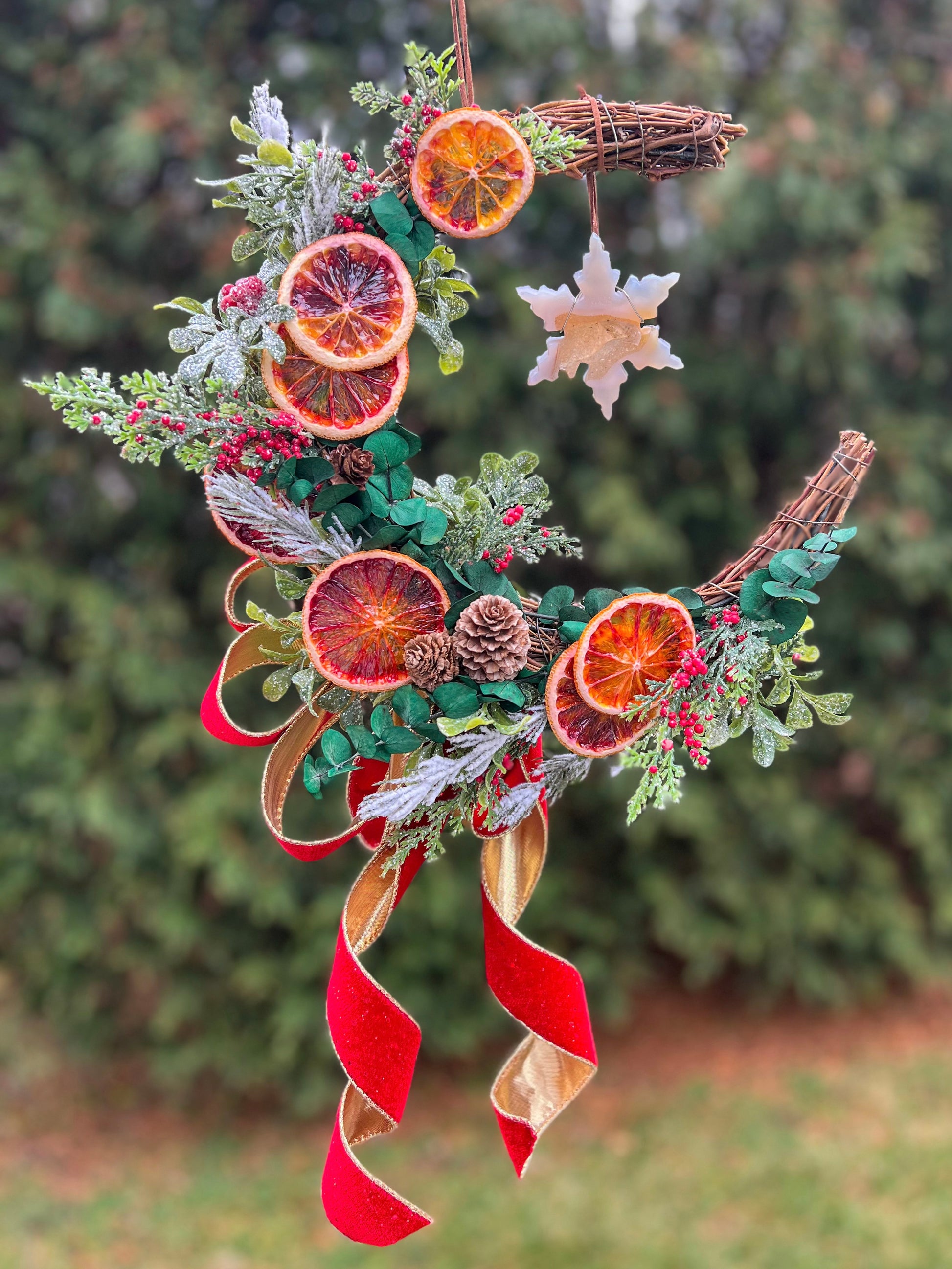 A crescent shaped grapevine wreath lush with natural eucalyptus, pine cones, dehydrated blood oranges, shimmering red berries, and softly glittered evergreens. A rich red and gold velvet bow brings in that old world warmth. Suspended in the center is a genuine agate snowflake carving with a sparkling druzy pool and a cluster of clear quartz, hand wrapped in sterling silver. Every slice of citrus is fully dehydrated and sealed with a double coat of glossy acrylic for protection and shine. A handmade piece crafted to last through many moons to come.