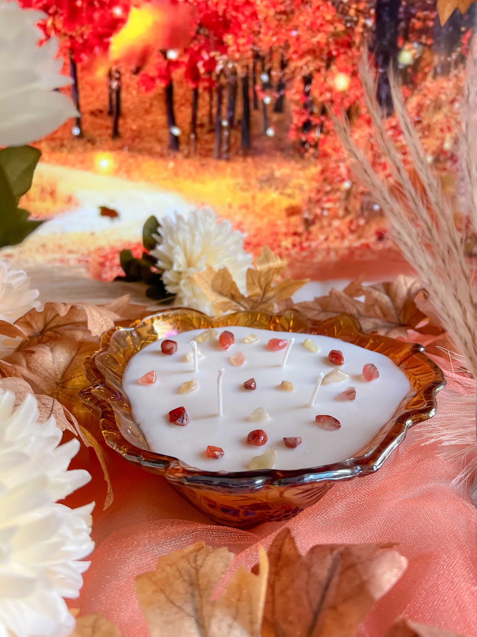 This one of a kind vintage Indiana Glass Loganberry bowl has been hand poured with Enchanted Orchard, a bewitching scent inspired by crisp autumn air, ripe fruit, and a touch of seasonal spice. The fragrance is warm, grounding, and truly mouthwatering! It has been topped with genuine carnelian and citrine gemstones for an added magical touch.
