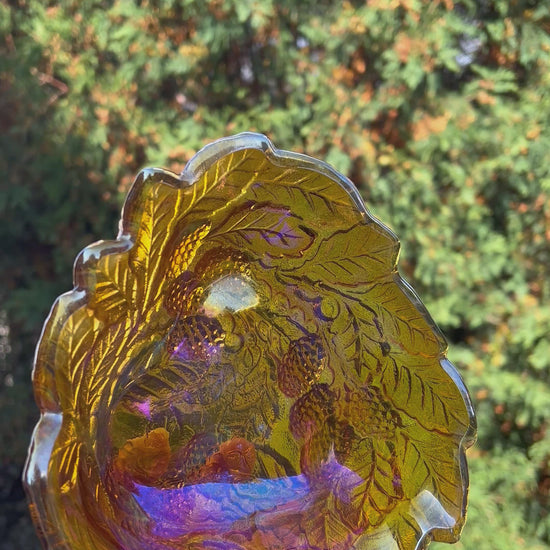 The vessel itself is a collectible treasure! Shimmering marigold carnival glass with an iridescent rainbow finish and delicate leaf and vine details. Once the candle has been enjoyed, the bowl remains as a keepsake piece of vintage decor to treasure for years to come. Hand poured in small batches with intention.