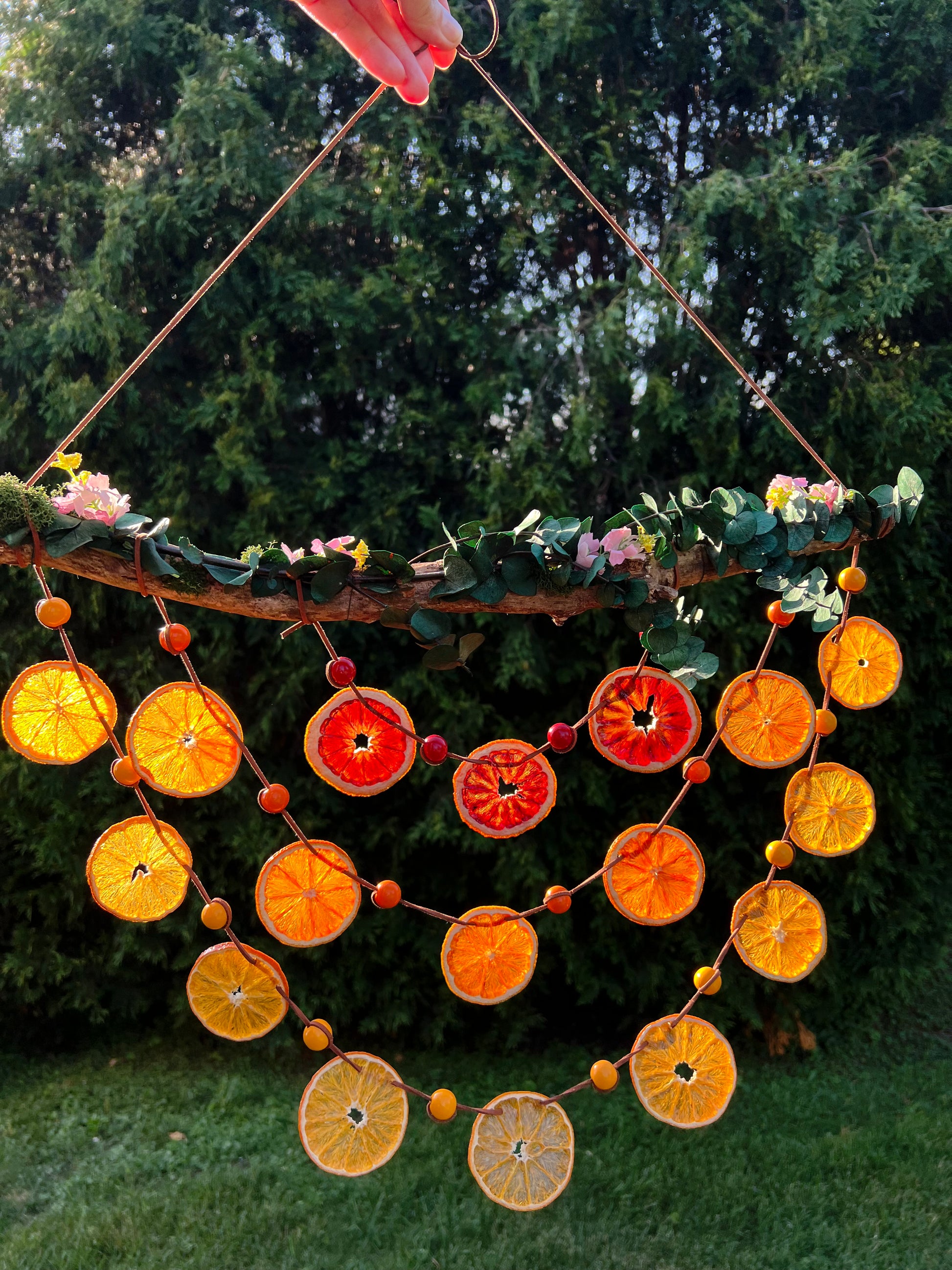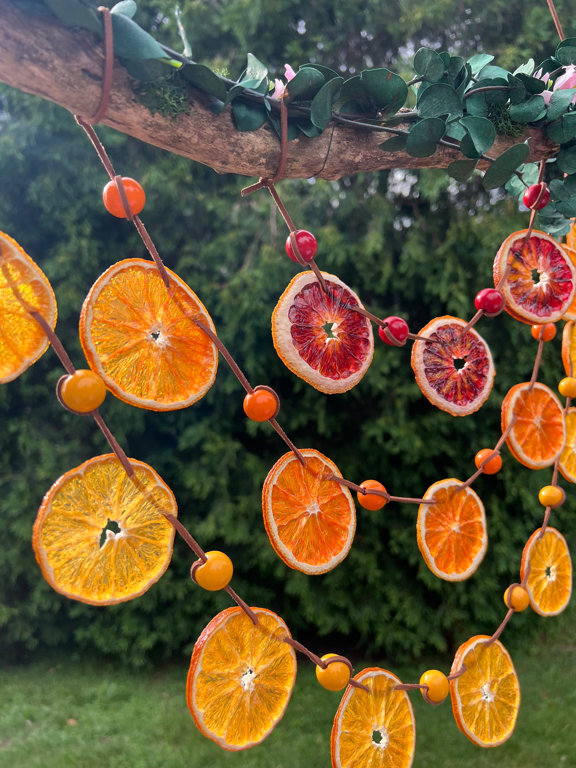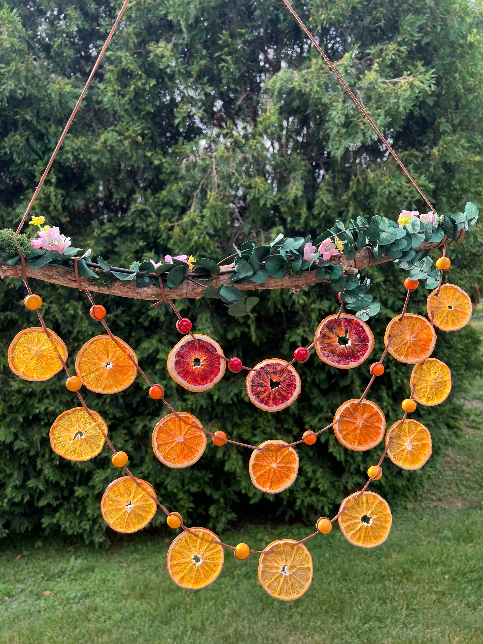 Dried navel, cara cara and blood oranges are strung in gentle arcs across a foraged branch, adorned with moss, faux florals, and dried eucalyptus for a naturally enchanted look. Perfect for windows, garden walls, or party decor. All citrus has been fully dehydrated and double coated in a high gloss acrylic for longevity and protection.