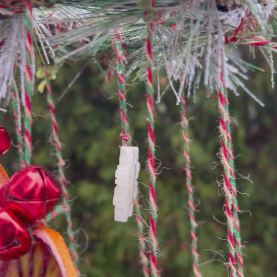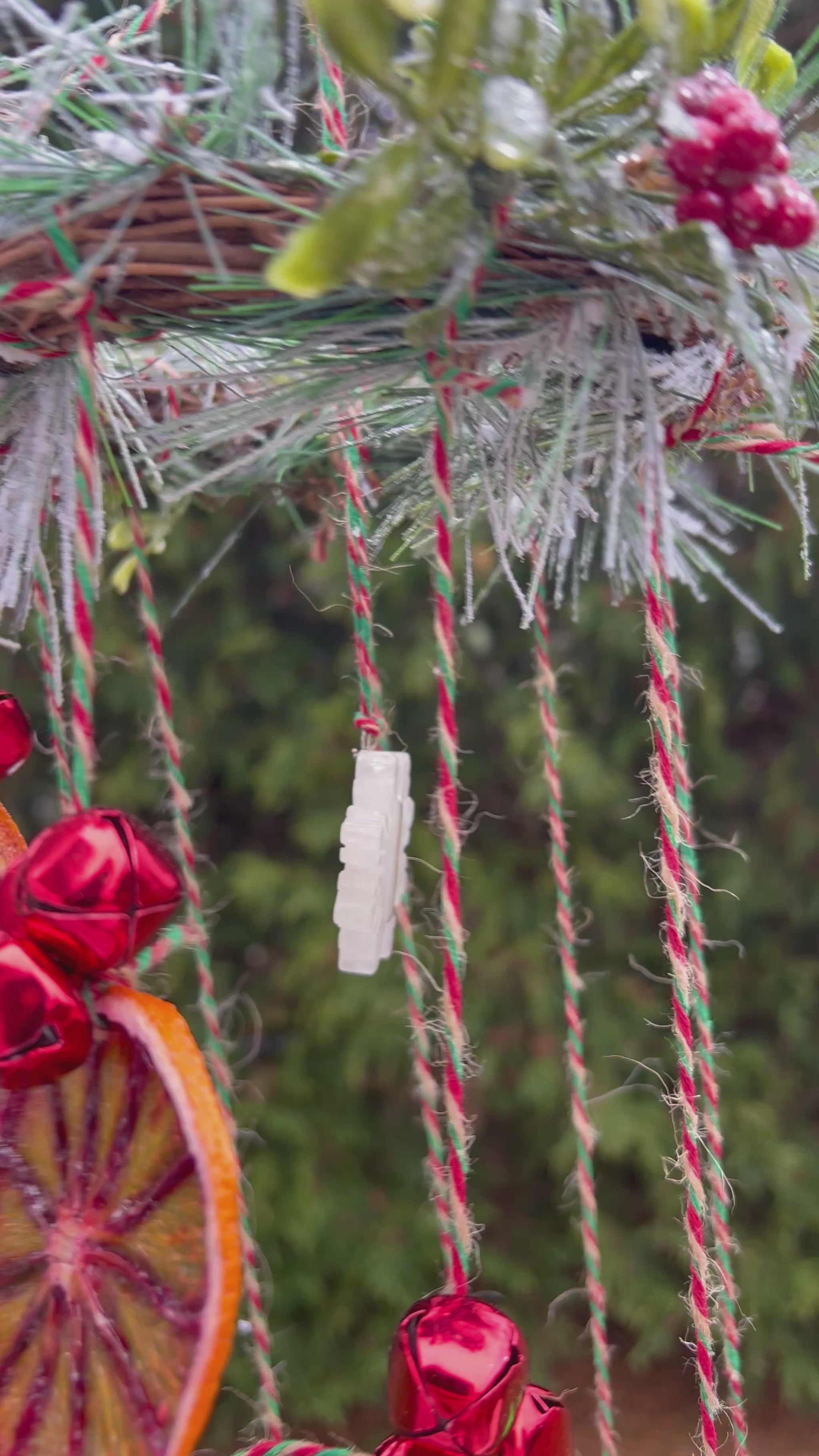 This unique spiral style citrus suncatcher features a vibrant mix of Cara Cara, navel, and blood oranges, each slice hand sewn with festive red, green, and gold jingle bells on coordinating twine. It’s tied to a beautiful grapevine wreath adorned with frosted evergreens and sparkling holly berry accents. At the center hangs a genuine clear quartz snowflake carving, hand wrapped in sterling silver for an extra touch of winter magic. Every citrus slice is fully dehydrated and double coated in high gloss acrylic for added protection and shine. Crafted to enchant and endure for many years to come.