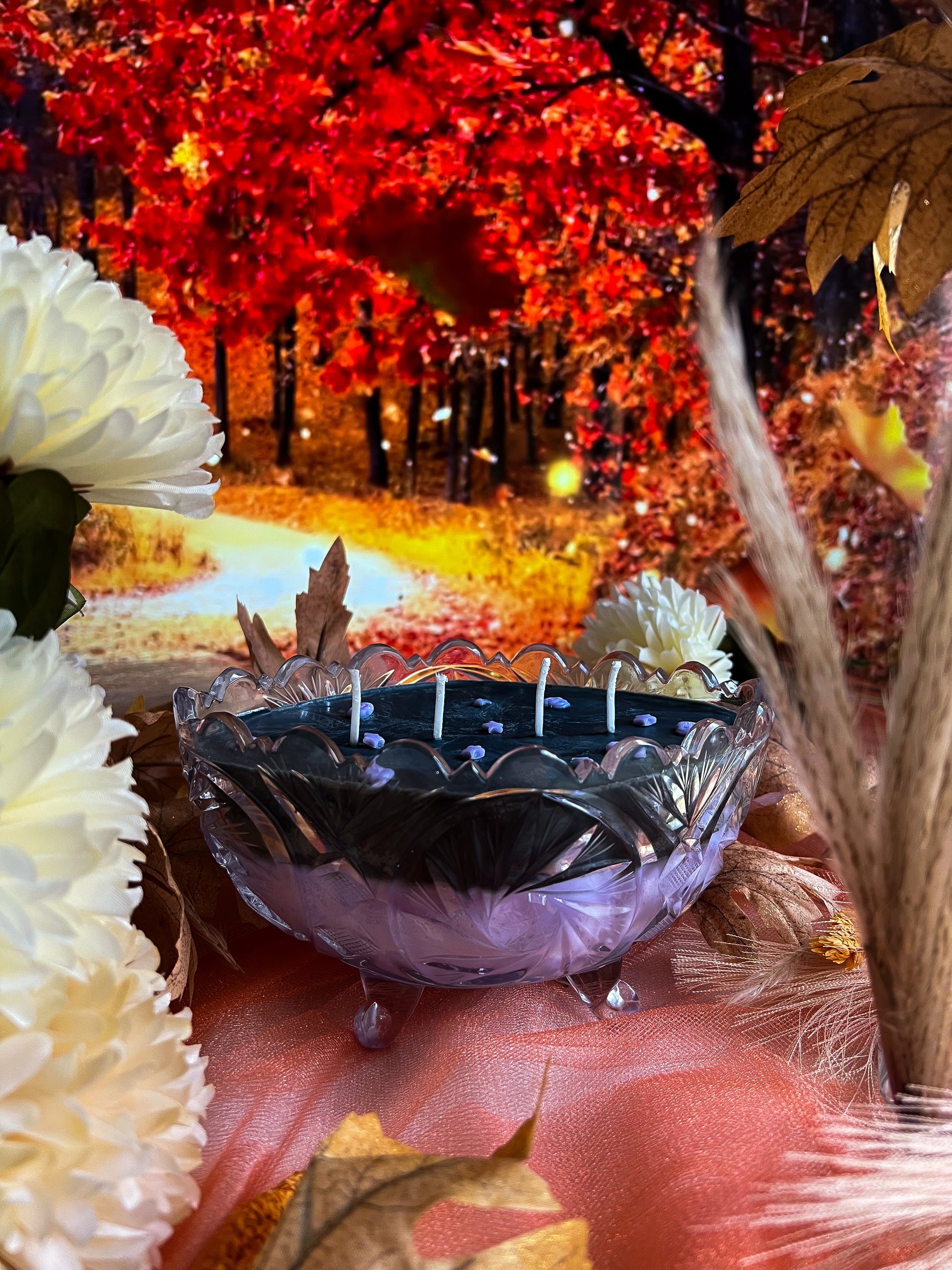 Adding a whimsical touch, the surface is adorned with mini purple wax charms shaped like stars and jack o’ lanterns, giving this candle a playful, magical energy. Once burned, the footed dish remains a sparkling vintage keepsake perfect for display, trinkets, or a little bit of everyday magic.