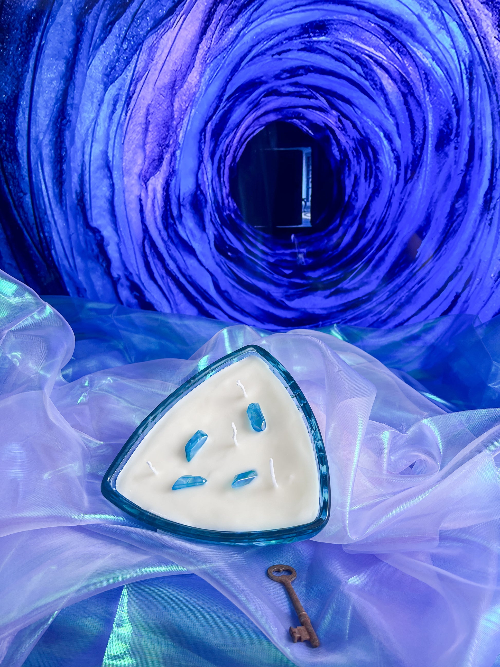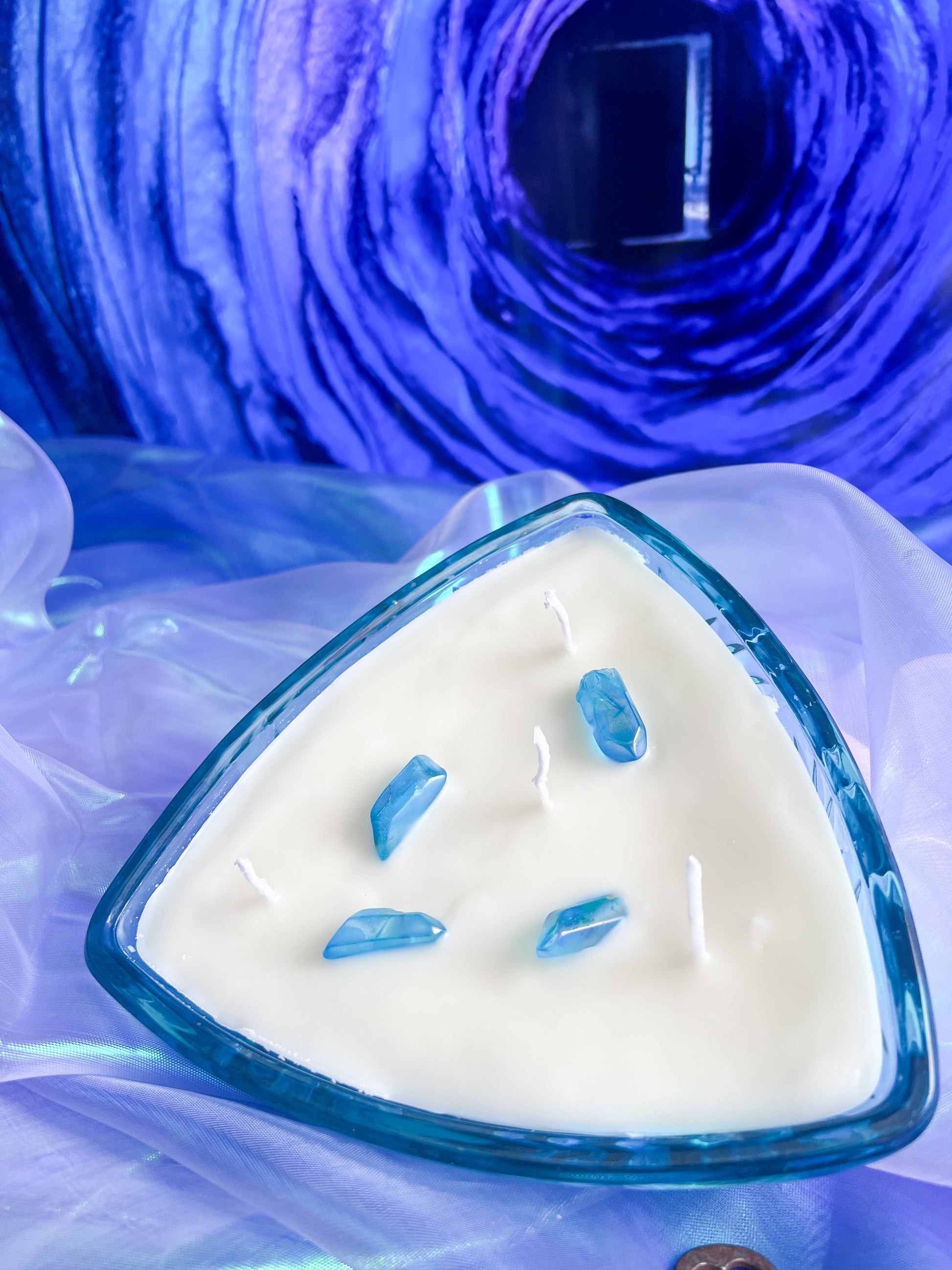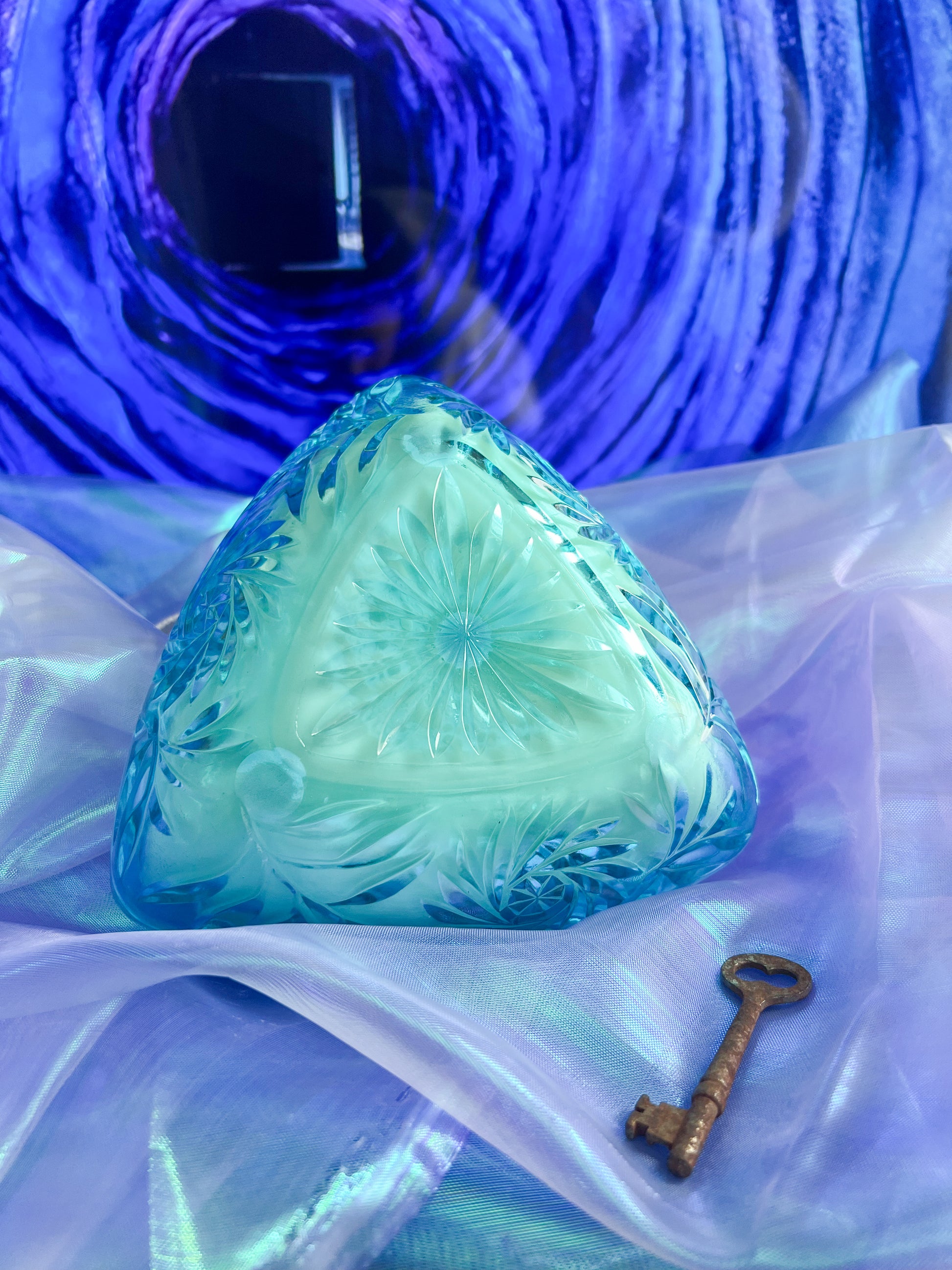 This candle is set into a vintage Hazel Atlas aqua blue starburst trinket dish. Each vessel is carefully sourced and curated for its luminous color, unique shape, and collectible charm. By giving new life to this antique glassware, every candle becomes a one of a kind piece to treasure for years to come.