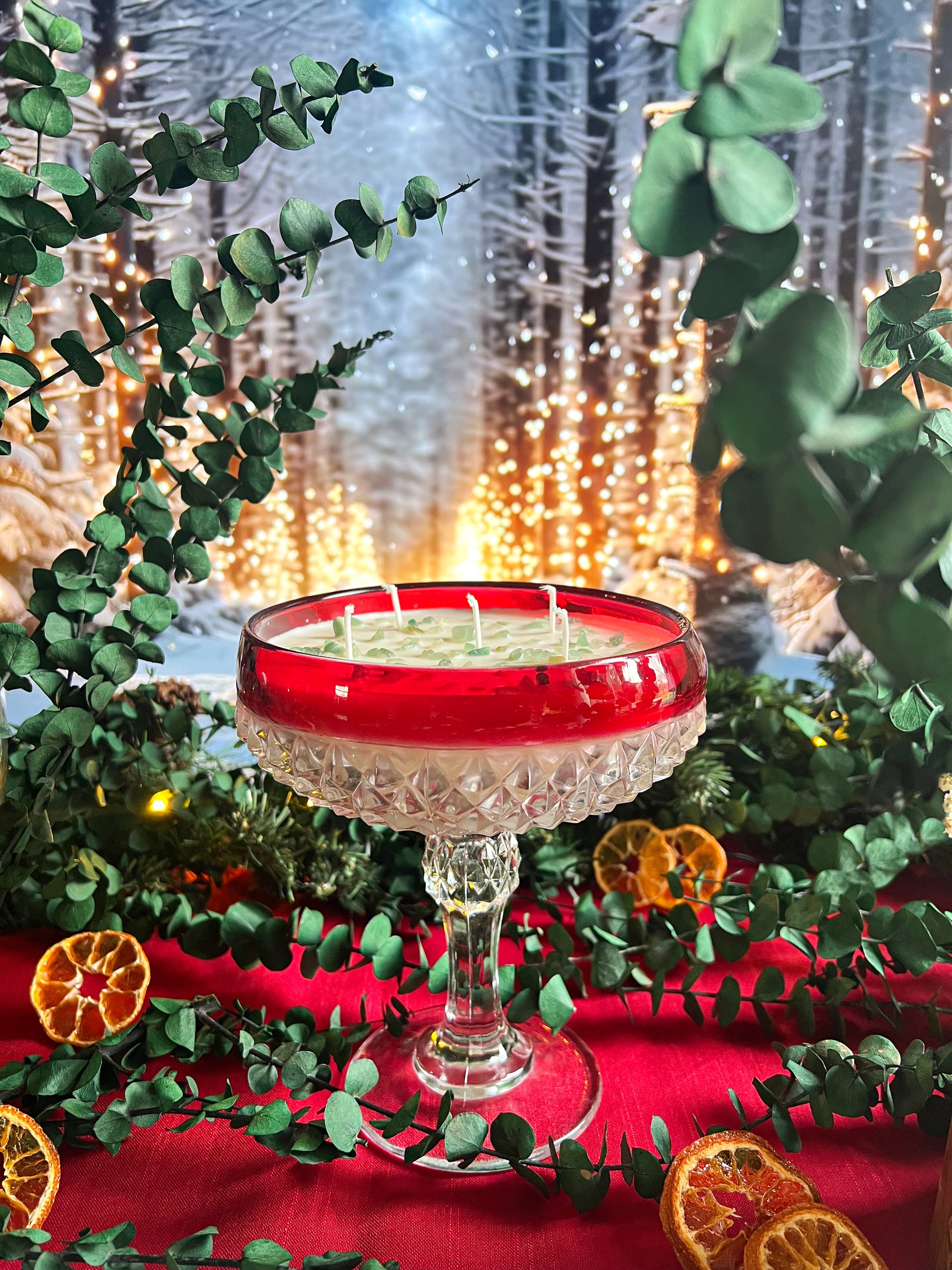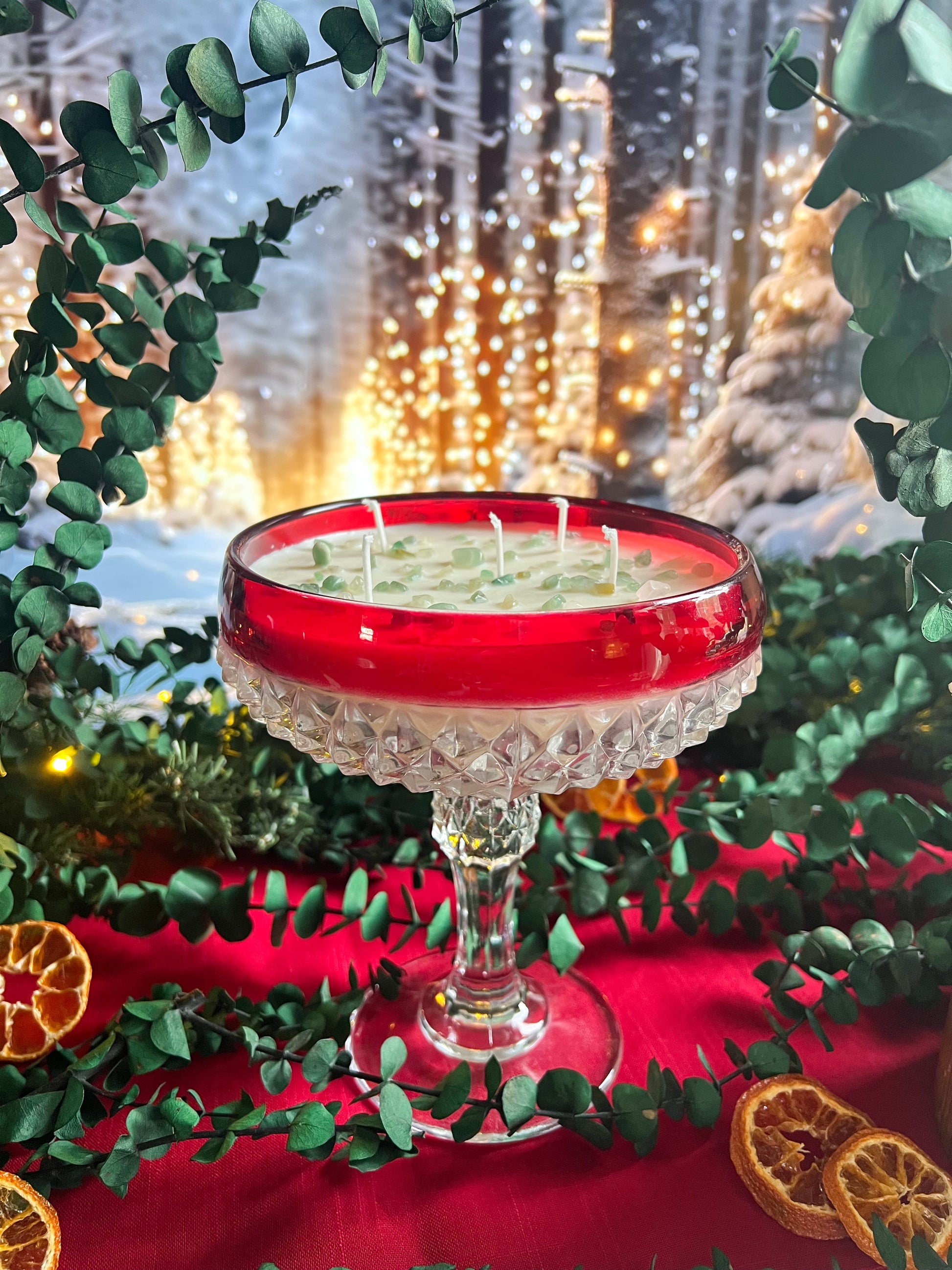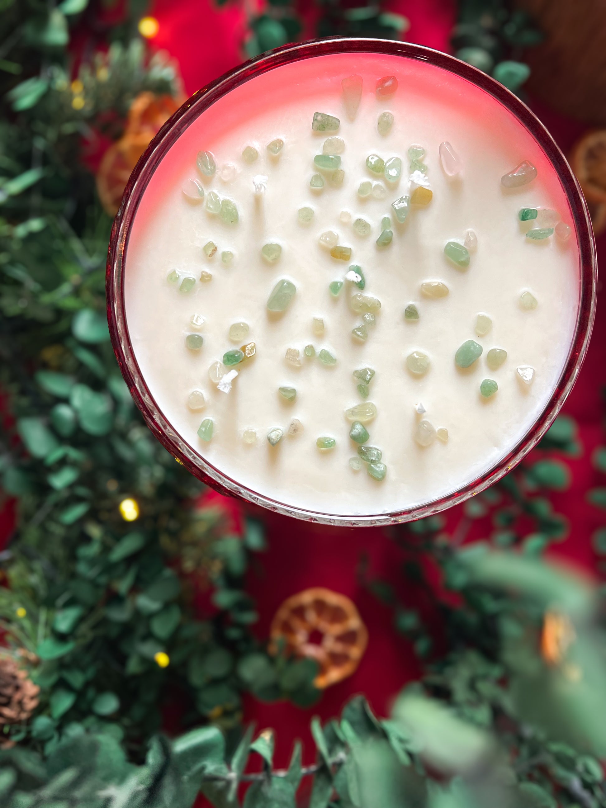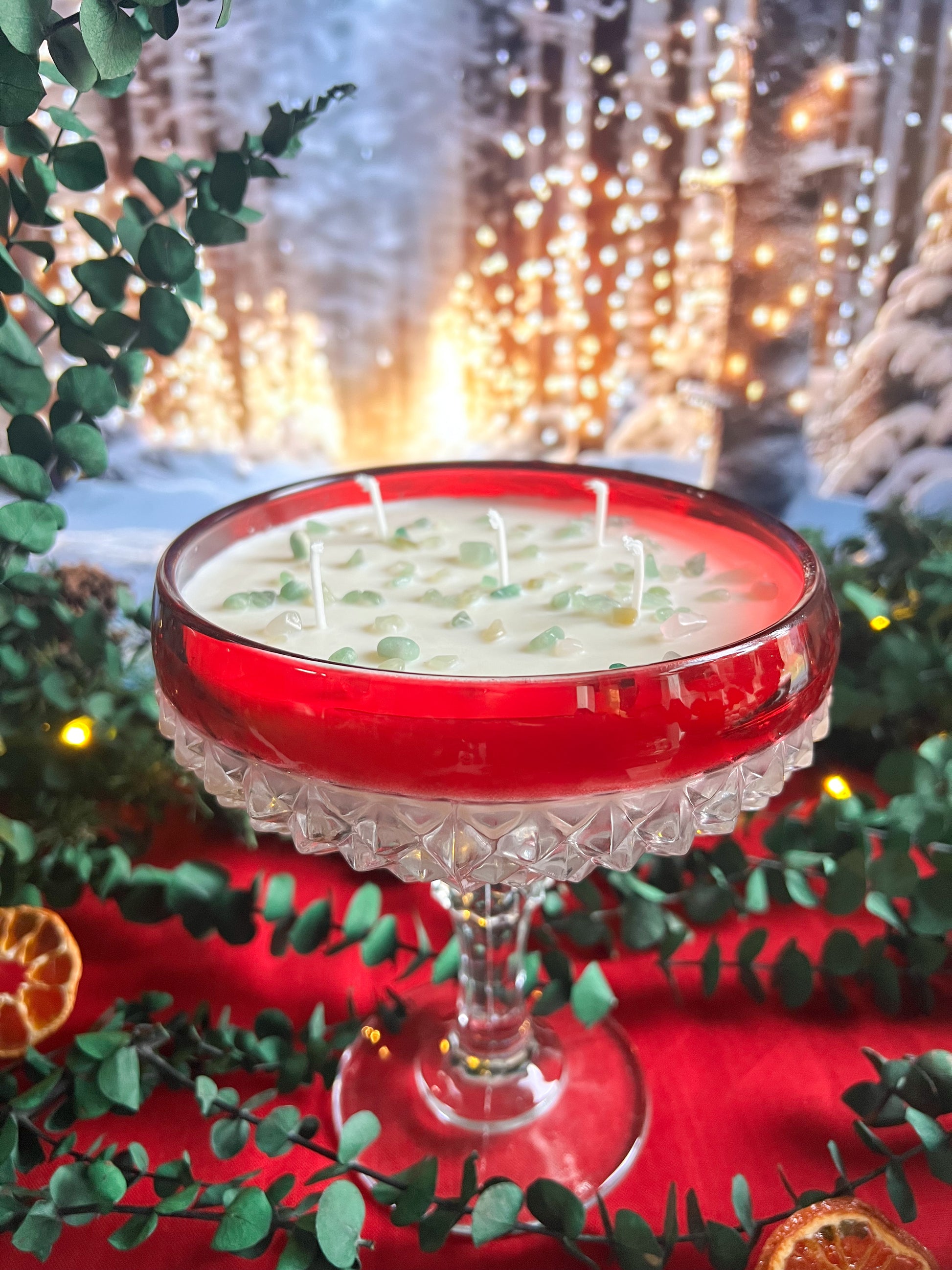 This large, rare vessel candle is set in a vintage Indiana Glass Ruby Flash Candy Dish Compote (Diamond Point Ruby), featuring deep ruby red tones with a clear base and banded ruby accents. Filled with Snow Capped Pines, it captures the crisp, fresh aroma of a winter forest with just cut evergreens. Perfect for bringing the outdoors inside, this candle evokes the quiet magic of snow dusted pine boughs on a crisp winter day. Topped with genuine crushed jade crystals.