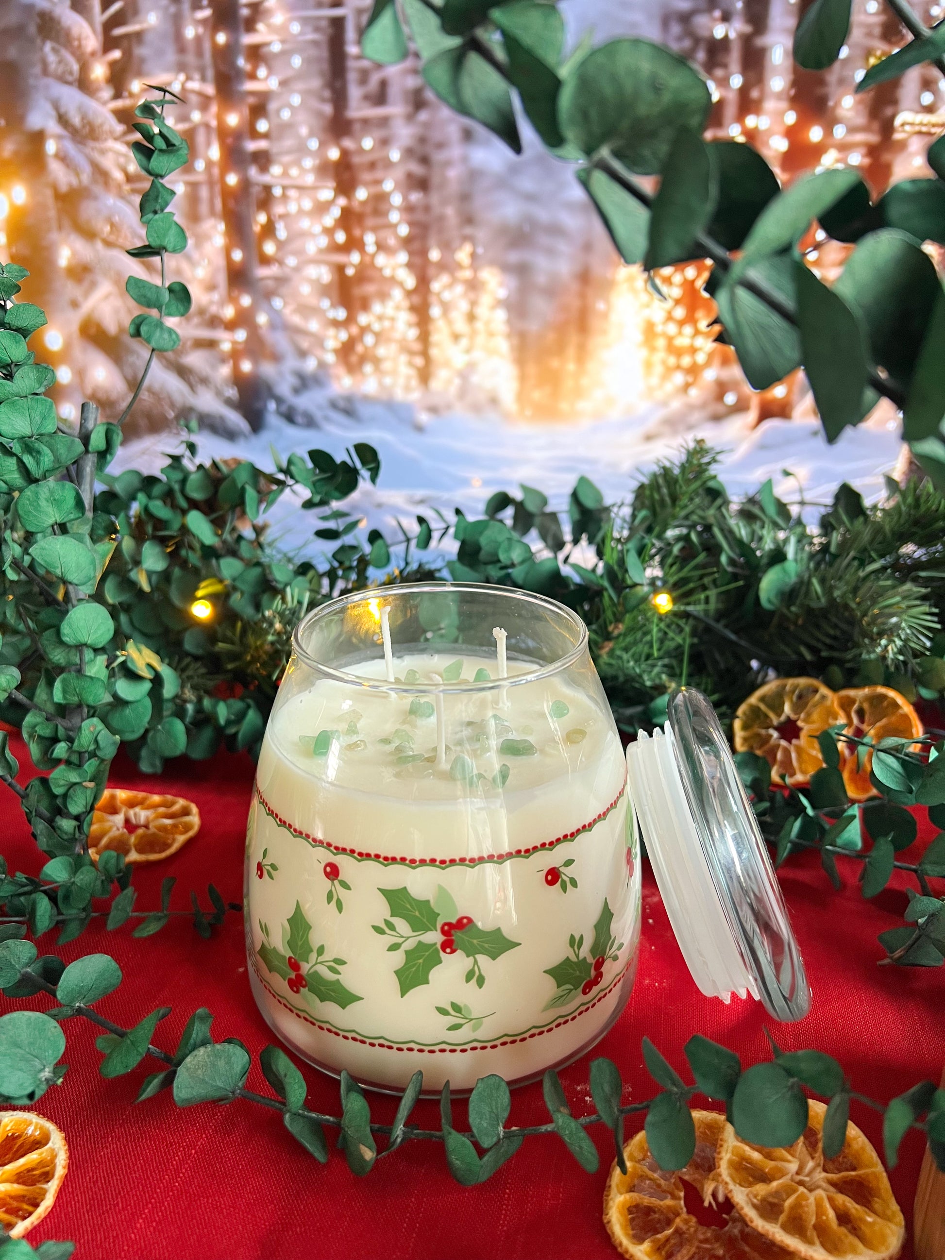 This rare candle is poured into a vintage Libbey Glass Christmas Canister featuring a charming holly pattern, filled with Solstice Hearth, a warm, inviting blend of pine, bright citrus, clove, allspice, cinnamon, maple, musk, and vanilla. The surface is topped with jade crystals, adding protective, heart centered, and grounding energy. Perfect for evoking cozy winter evenings by a crackling fire, this candle combines vintage charm, seasonal warmth, and subtle magic in one collectible piece.