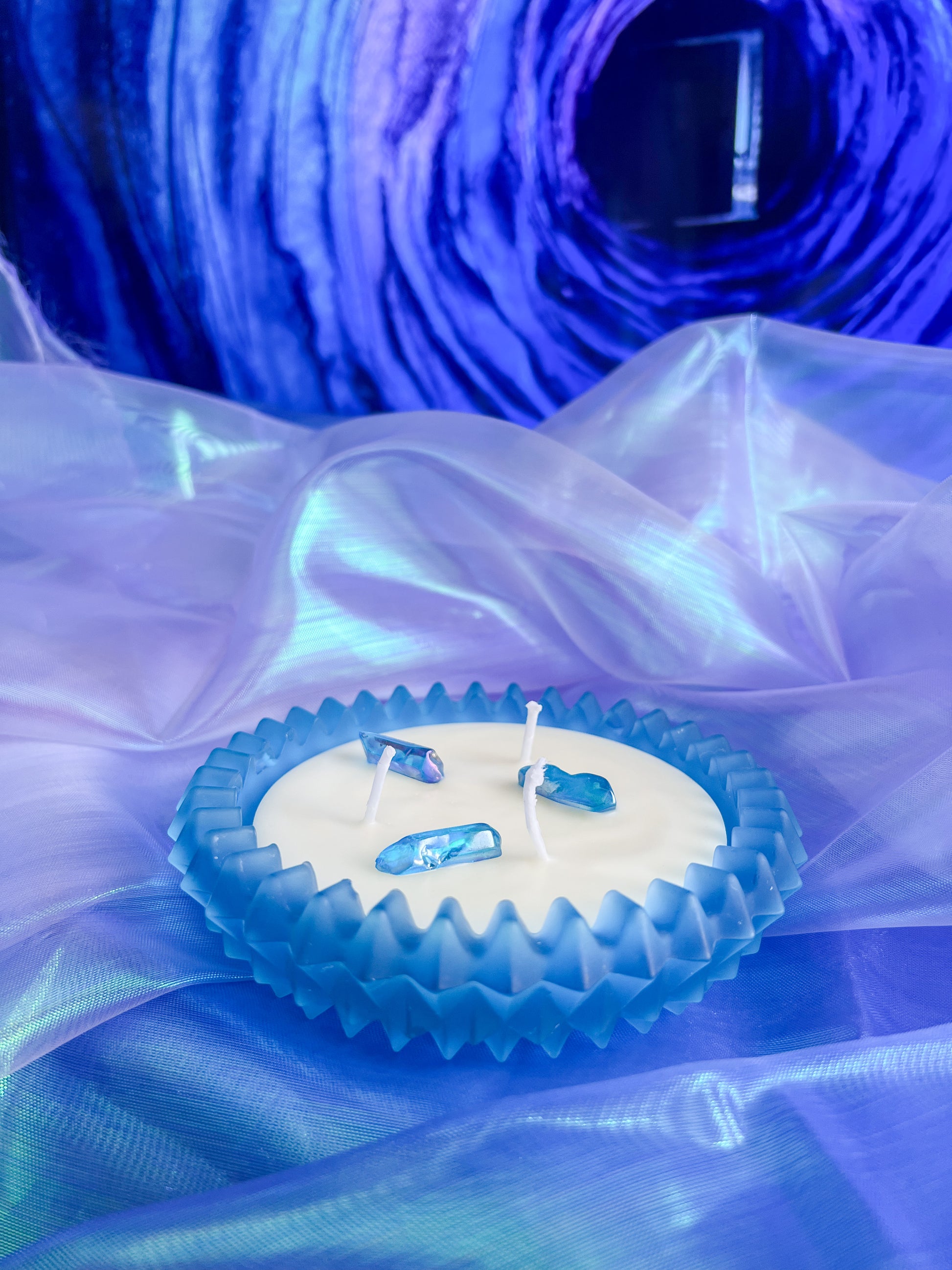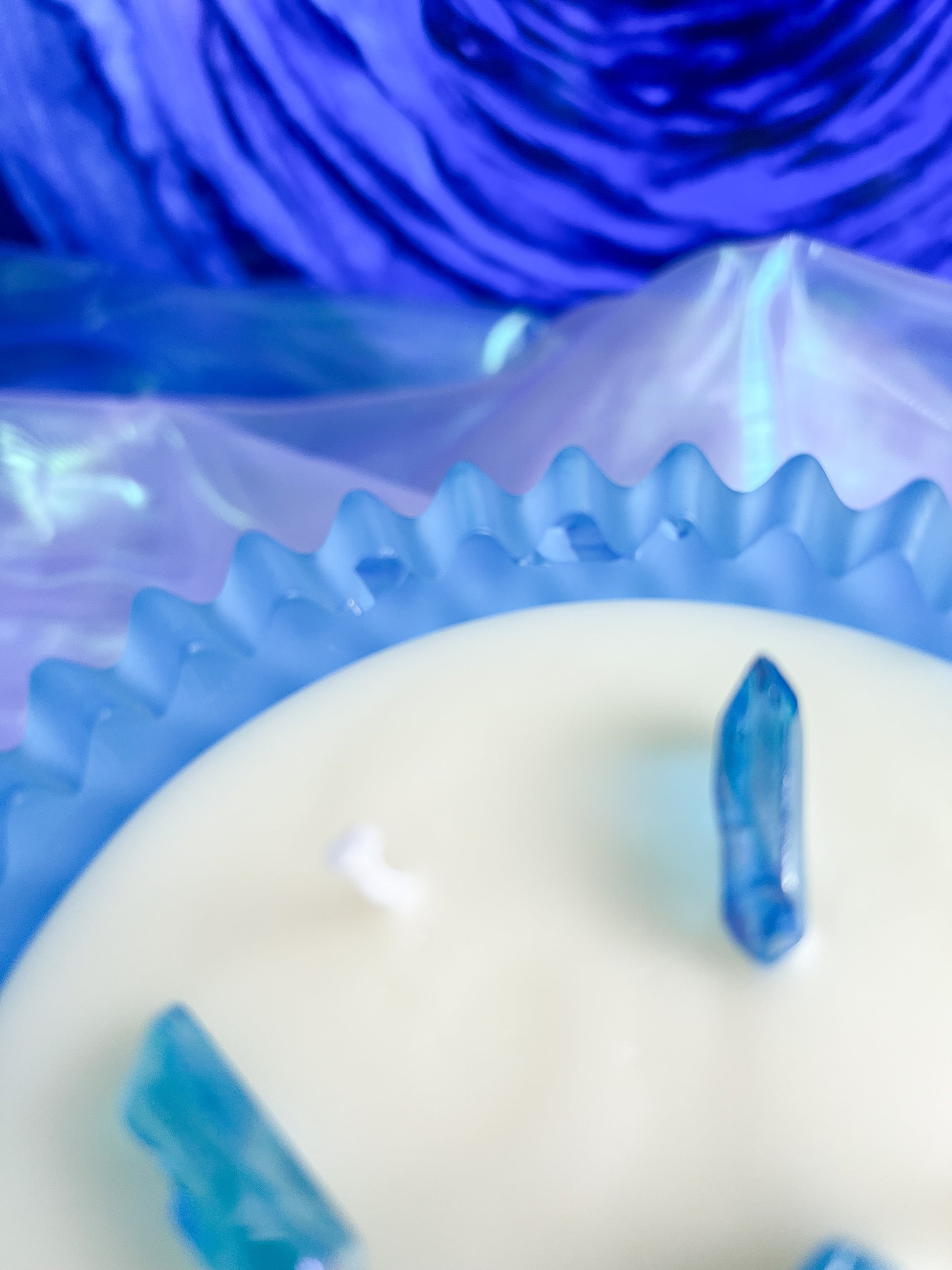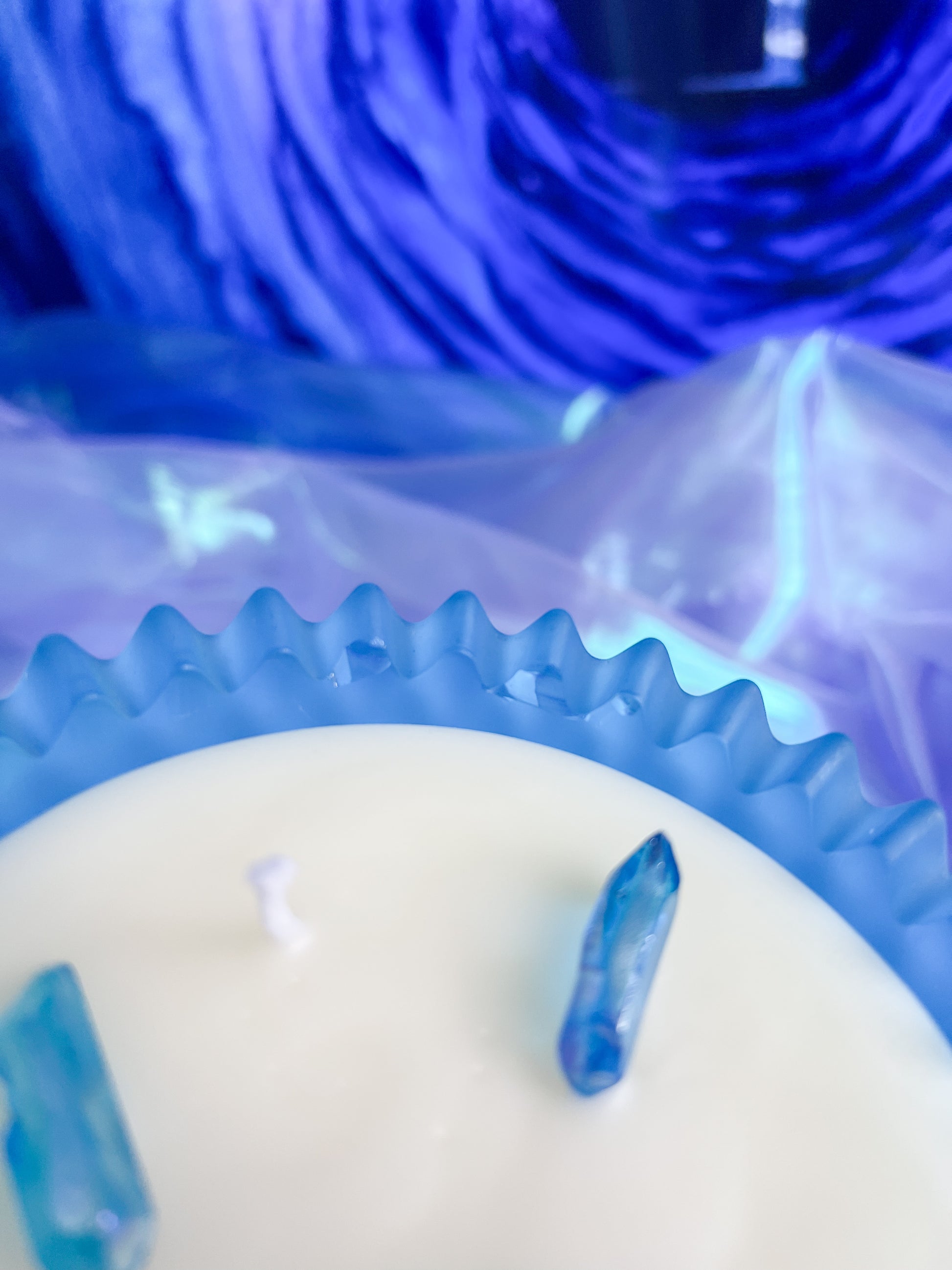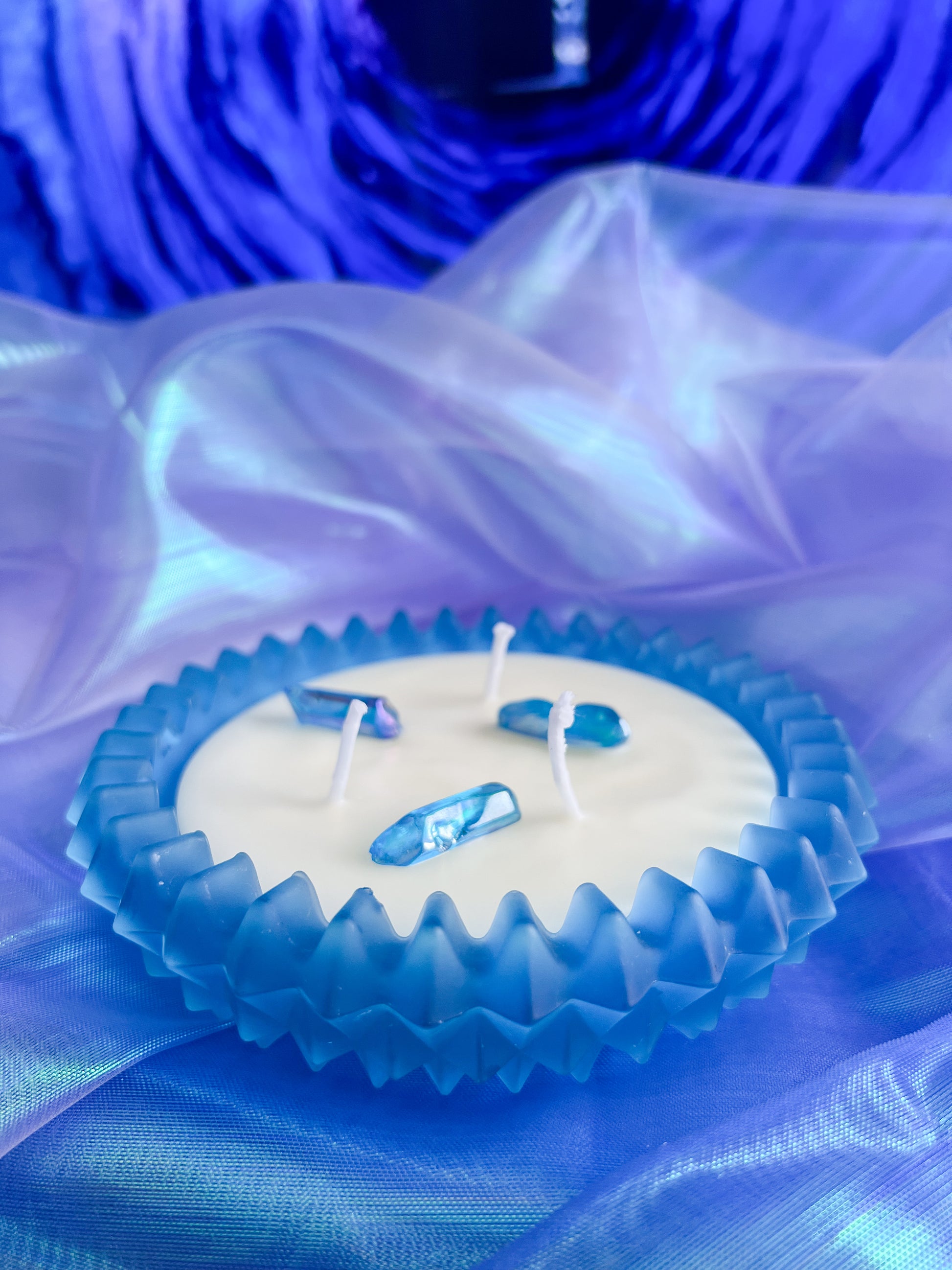 This candle is set into a vintage Indiana Glass Diamond Point Blue Frosted Satin candy trinket dish. Each vessel is carefully sourced and curated for its color, texture, and character, giving new life to a collectible antique. This piece has a few tiny chips along the edge, reflecting its age (see pictures) but does not affect its function or collectible charm!