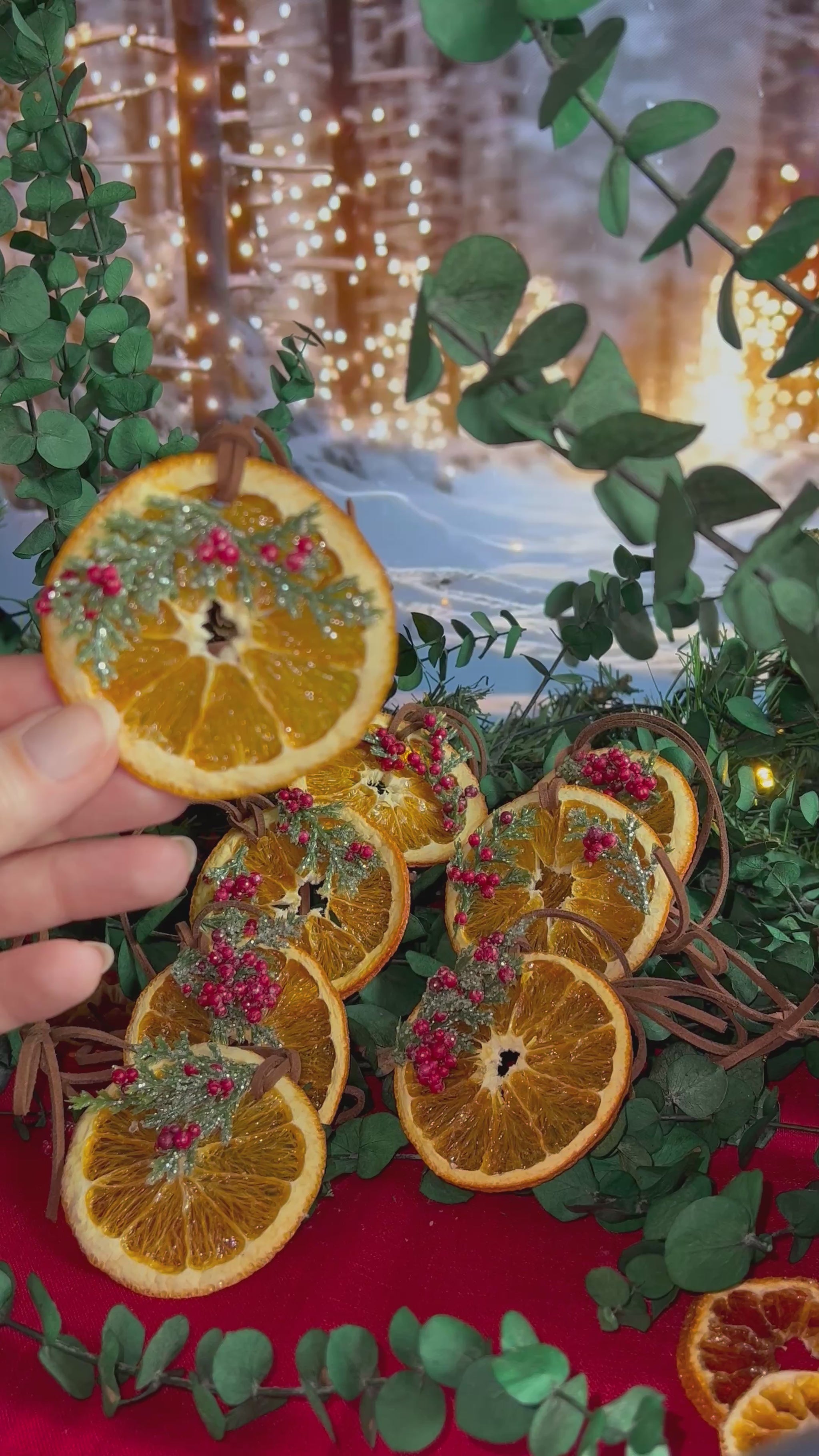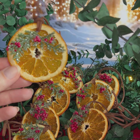 Bring sparkle and warmth to your holiday tree with this set of eight handmade ornaments. Each Cara Cara orange is fully dehydrated, accented with glittering holly and evergreen sprigs, and double coated in high gloss acrylic for lasting shine and protection. Finished with brown vegan leather cord ties, these ornaments are a vibrant, enduring addition to your decor. Crafted for those who cherish artisanal holiday decor, their meticulous detailing and heirloom quality construction make this set a standout investment in seasonal joy.